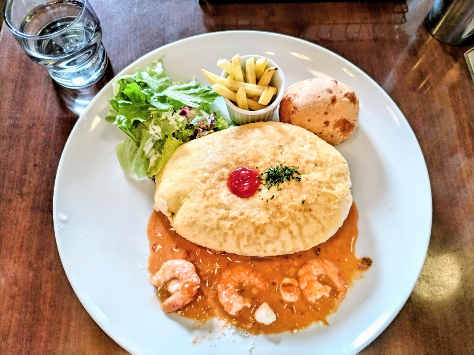 お初のスフレオムライス🥄 今日のランチは出先の「サロン 卵と私」で、トマトクリームソースのスフレオムライスランチでした🍅🥄スフレオムライスというものを今回初めて食べたのですが、ものすごくきめの細かいシュワシュワした卵焼きを食べているような不思議な感じでした✨付け合わせにサラダとポテト、もちもちチーズパンもついて味も全部おいしかったのですが、私には少しボリューミーでした😅