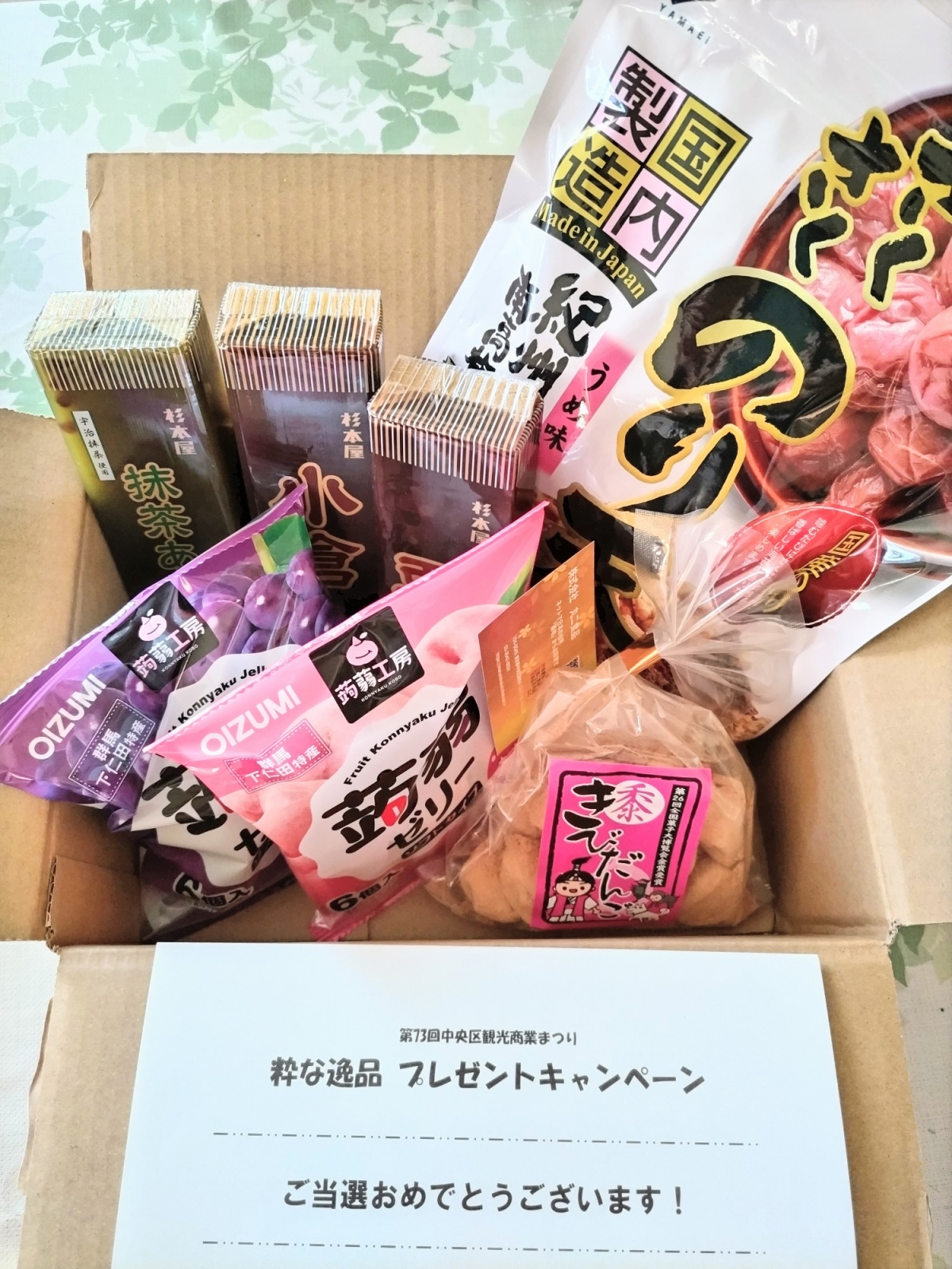 久しぶりに懸賞に当選🎯 私の趣味の一つに懸賞応募があるのですが、今日久しぶりに懸賞に当選しました🎉「中央区観光産業まつり 粋な逸品プレゼントキャンペーン」にて、お茶うけセット(ジャンボ羊羮×3、梅のり天、きびだんご、こんにゃくゼリー×2)が当たりました‼️ありがとうございます✨こんにゃくゼリーは私個人のおやつに、その他は家族全員でおいしく頂きたいと思います😋