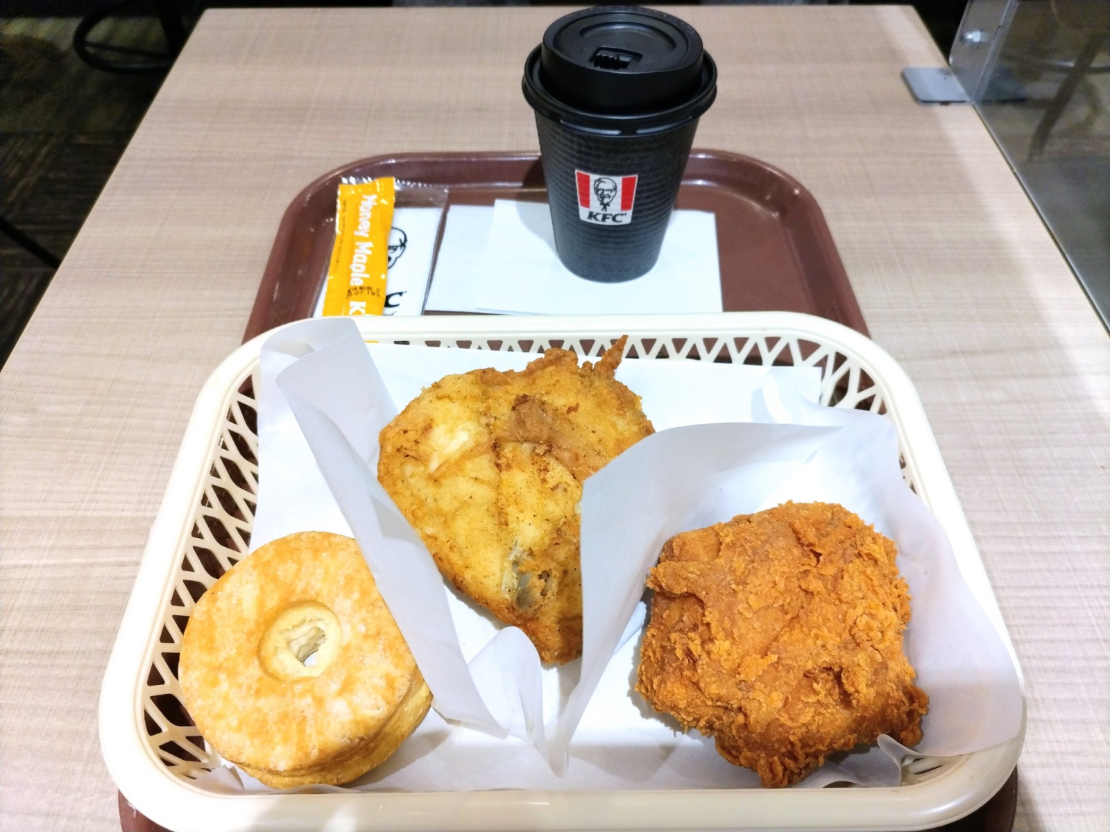 ケンタの食べ比べセット🌶️ 今日のお昼は出先のケンタで、オリジナルチキンとレッドホットチキンの食べ比べセットでした✨先月食べたレッドホットチキンがおいしかったので、期間が終わらない内にまたリピートしちゃいました😆サイドはこれまた大好きなビスケット💕ドリンクはホットコーヒーにしました☕チキン2Pがどちらもけっこう大きい部位に当たったのでお腹がいっぱいになりました😅