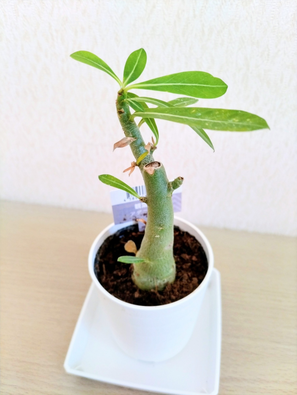 かくいう私は、塊根植物に関しては全くのド素人なのですが、今回見つけた子は葉の状態こそ少し悪いですが、肝心の塊根部分が少し膨らみの気配を見せていてかわいいと思いお迎えしてきました😊(ダイソー産の100円アデニウムはもっと真っすぐ鉛筆みたいに細長い子も多いので💦)